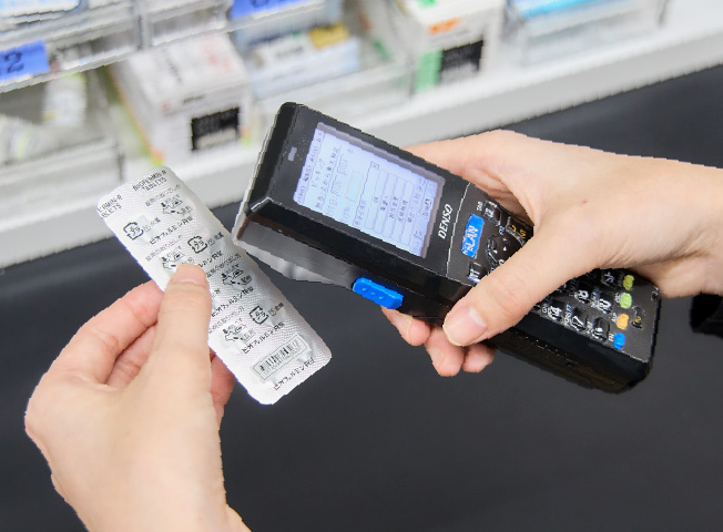 全店舗導入ハンディスキャナで薬品ごとのバーコードを読み取ることで、薬品の規格違いや2重取り、入力間違いなど、調剤過誤や調剤ミスを防止します。