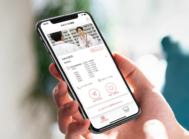 全店舗導入薬局を「かかりつけ薬局」として利用できるスマートフォンアプリ。処方箋の受信やチャットでのお薬相談、服薬指導などをオンラインで完結できます。
