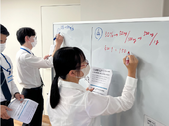 トラストファーマシーの研修は、医療知識(薬物・病態・栄養)の習得に加え、在宅医療における考え方、技術等の実践トレーニングを含め、ロールプレイング、ディスカッションを多く取り入れています。チーム医療を担う薬剤師としての土台作りに力を入れています。