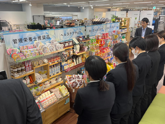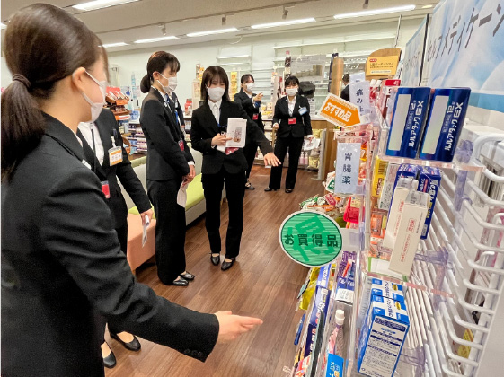 トラストファーマシーでは、薬剤師&管理栄養士の選定した食品やOTC(一般医薬品)の販売にも力を入れています。ただ、どんなに素晴らしい商品も、来局者さまに手にとってもらえないと意味がありません。来局者さまが気づき、興味をもってもらえるような商品陳列の知識を学びます。